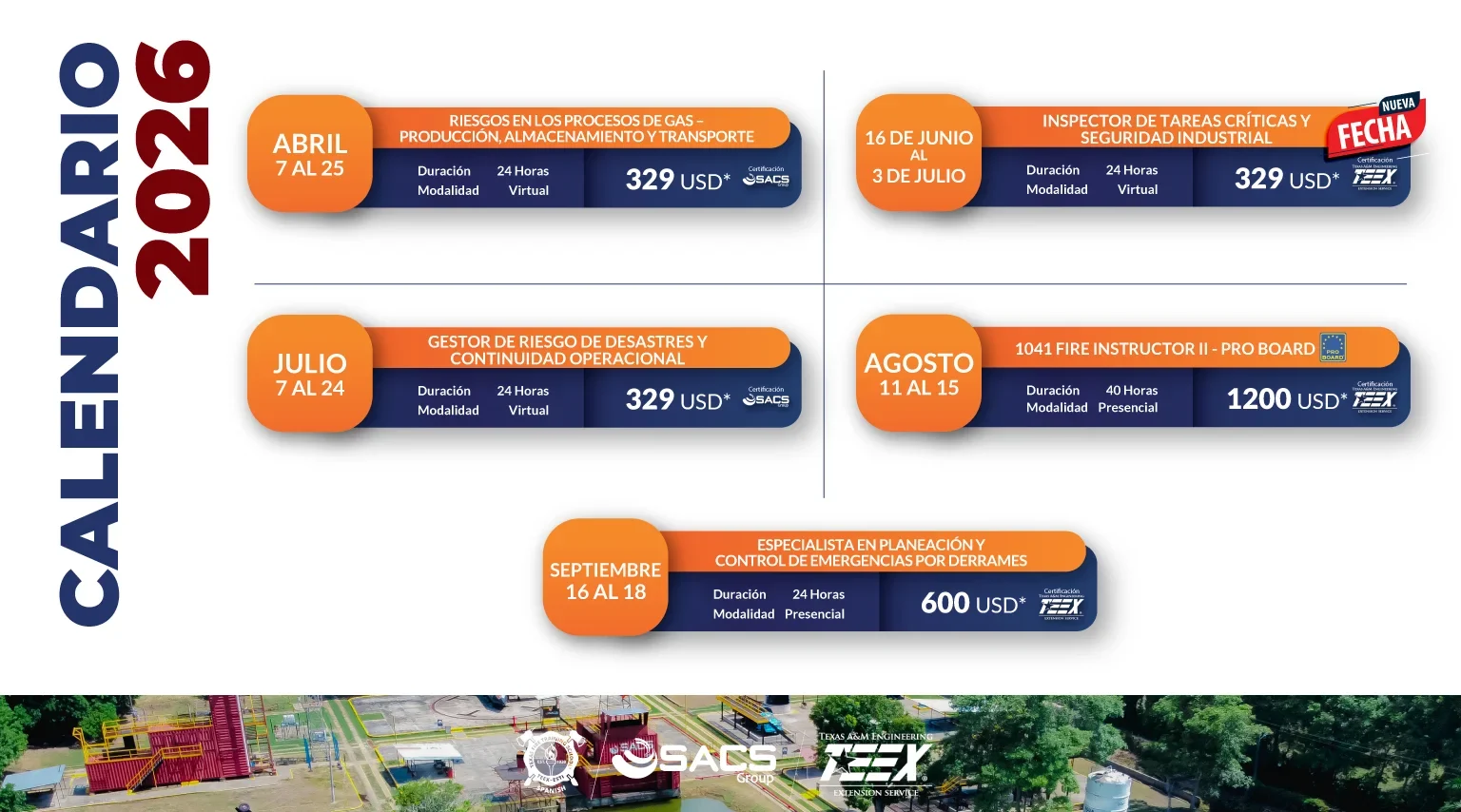 En 2026, Sacs Academy presenta su calendario abierto de formación especializada, diseñado para fortalecer las competencias técnicas y estratégicas de profesionales responsables de la gestión del riesgo, la seguridad industrial y la respuesta ante emergencias.